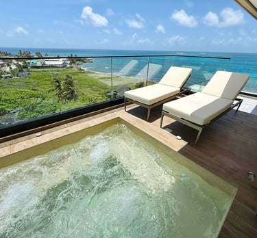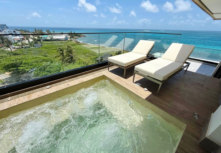 Experimenta el lujo en nuestro penthouse de alta gama, equipado con piscina privada en el balcón con vista al mar.